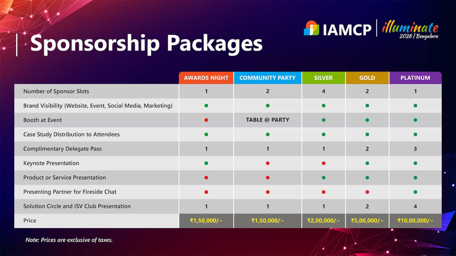 Become a vital part of IAMCP Illuminate 2026 by choosing the sponsorship package that best aligns with your goals. Each package is designed to maximize your brand visibility, provide meaningful engagement, and position your organisation as a leader within the Microsoft ecosystem. (Kindly click on image and zoom in for mobile)