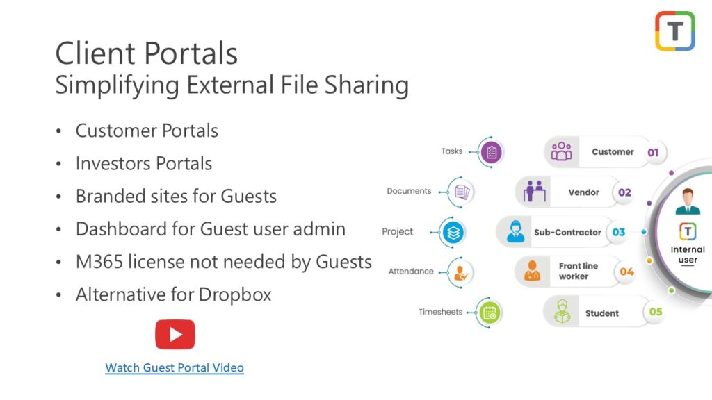 Titan Workspace enables organizations to create branded, secure client portals within Microsoft 365, allowing seamless file sharing and collaboration with customers, vendors, and partners. These portals eliminate the need for third-party tools like Dropbox or ShareFile, which often sit outside the compliance perimeter of Microsoft 365. With Titan Workspace, external users gain a professional, easy-to-use interface for accessing files, submitting documents, and collaborating securely—while all content remains governed by your Microsoft 365 security and compliance framework.